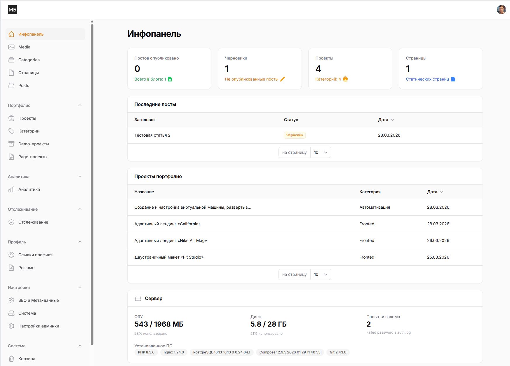 В начале марта я отложил учебу и принялся верстать шаблон. Написал фронтенд вручную — без фреймворков, по методологии BEM. Затем я купил VPS. Следом я настроил Ubuntu, nginx, PHP, PostgreSQL, Laravel, SSL. Filament - это отдельная тема. Это как будто универсальный конструктор, из которого можно построить хоть что. Так я развернул свой первый сервер на Laravel с использованием Filament.