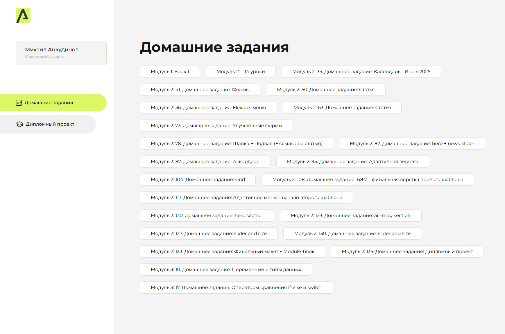 Сейчас я прохожу курс по веб-разработки на Aroken.ru. Все домашние задания я выкладываю в свой репозиторий. И хотя я уже владею базовой версткой и базовыми алгоритмами, я продолжаю проходить курс и сдавать домашние задания.